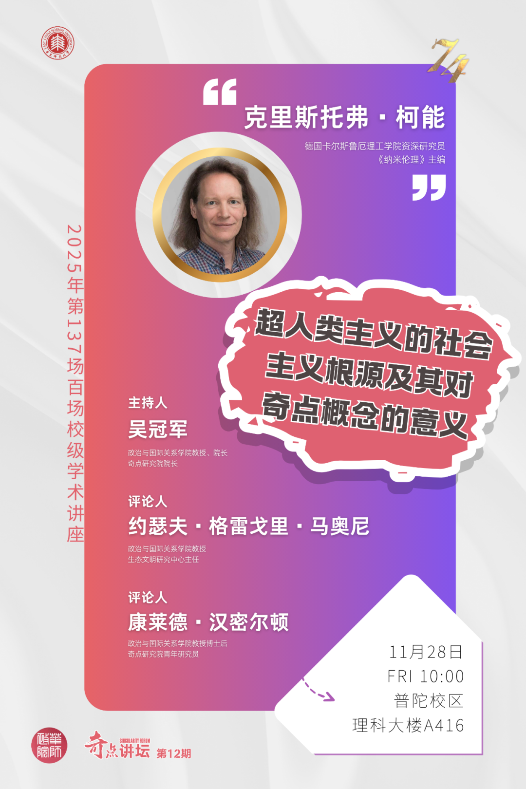 与普遍认知相反,超人类主义并不是一种在20世纪末或21世纪初才于美国兴起的新世界观。它的基本特征在19世纪便已被勾勒出来,而其首次完整表述,可以说是出现在1929年戴斯蒙德·伯纳尔(Desmond Bernal)的《世界、肉体与魔鬼:关于理性灵魂三大敌人的未来之探究》一书中。当前,超人类主义信仰和未来愿景在公共领域中最明显地呈现为美国亿万富豪的一种“替代宗教”,其中一些人(如埃隆·马斯克和彼得·蒂尔)更将其与政治上的反动甚至法西斯思想相结合,以为寡头统治和对所谓“西方自由民主”的斗争提供辩护。然而值得注意的是,和许多法西斯及极右翼意识形态一样,由于其思想原创性极低,这些论述不过是右翼对一个深深植根于社会主义与共产主义思想传统的理念谱系的挪用,而这种思想传统在伯纳尔上述文章中得到了最具代表性的表达。本次讲座将首先介绍并简要分析超人类主义的社会主义根源。随后,将进一步探讨这些根源如何与奇点概念的形成相关(从早期关于人与机器共同进化的思想、欧文·古德(Irving Good)提出的“智能爆炸”概念,到奇点概念的奠基者们,再到雷·库兹韦尔(Ray Kurzweil)等人在本世纪的影响性著作),并讨论奇点论及其发展在多大程度上补充了旧有的超人类主义思想。同时,也将考察自19世纪以来的政治语境变迁如何影响这一技术未来主义,以及我们能从中学到什么,以理解这种世界观未来可能的国际角色。