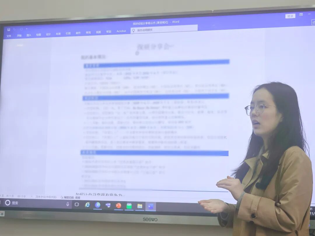 拟录取为我院政治学理论专业直博生的朱海彤同学在梳理保研时间线的基础上针对推免环节展开了详细介绍。她分享了如何准备简历、资料册、个人陈述等内容,同时介绍了一些推免新变化,建议同学们有针对性地进行准备。同时,她讲述了自己关于读博的想法,希望帮助同学们更好判断自己是否适合读博,并分享了一些现在可以准备的事项,鼓励同学们不断提升自我。