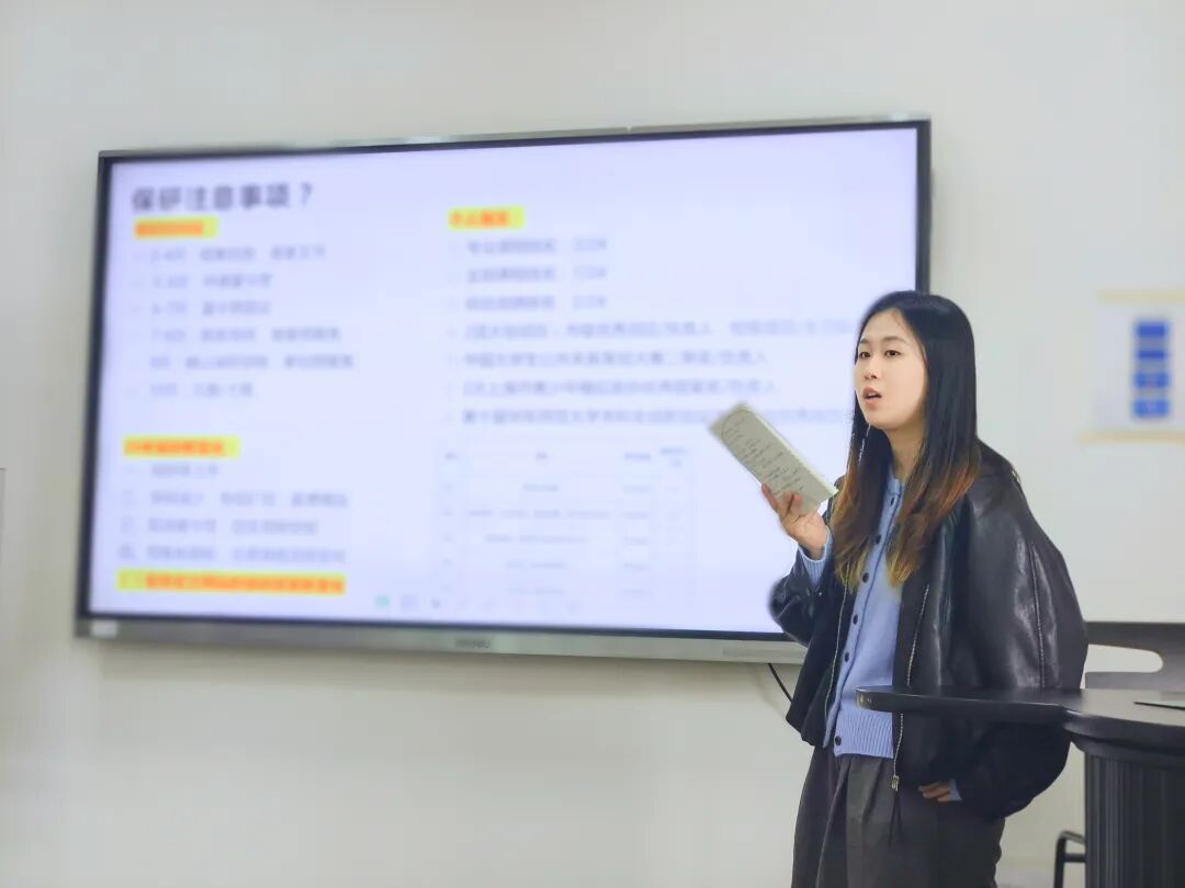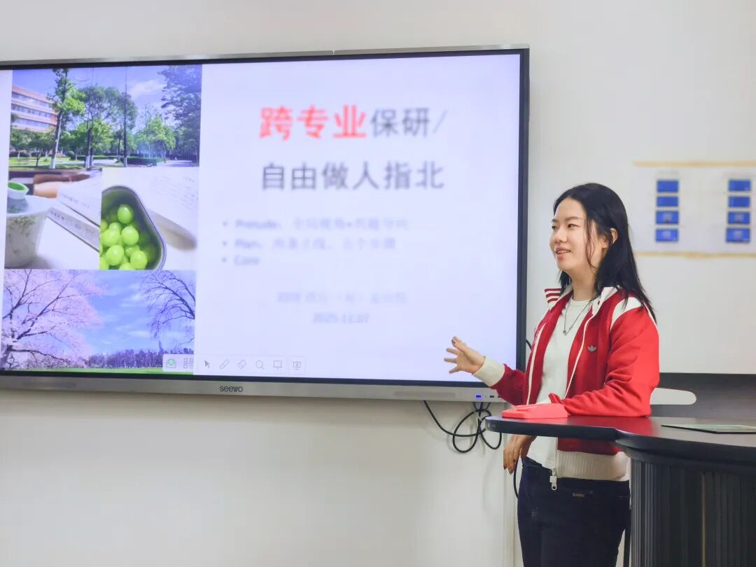 拟录取为我校思勉人文高等研究院中国古代文学专业硕士研究生的孟诗悦同学幽默风趣地为同学们介绍了如何进行跨专业保研。她建议同学们建立全局视角,与兴趣导向相结合,确定个人未来发展方向并持续挖掘个人兴趣。她分享了自己从大三开始准备保研的经历,激励同学们随时出发。同时她也强调要关注目标院校目标专业的招生要求,学会合理选择,如有留学交换等特殊经历,可以在资料中突出显示,展示个人特色。