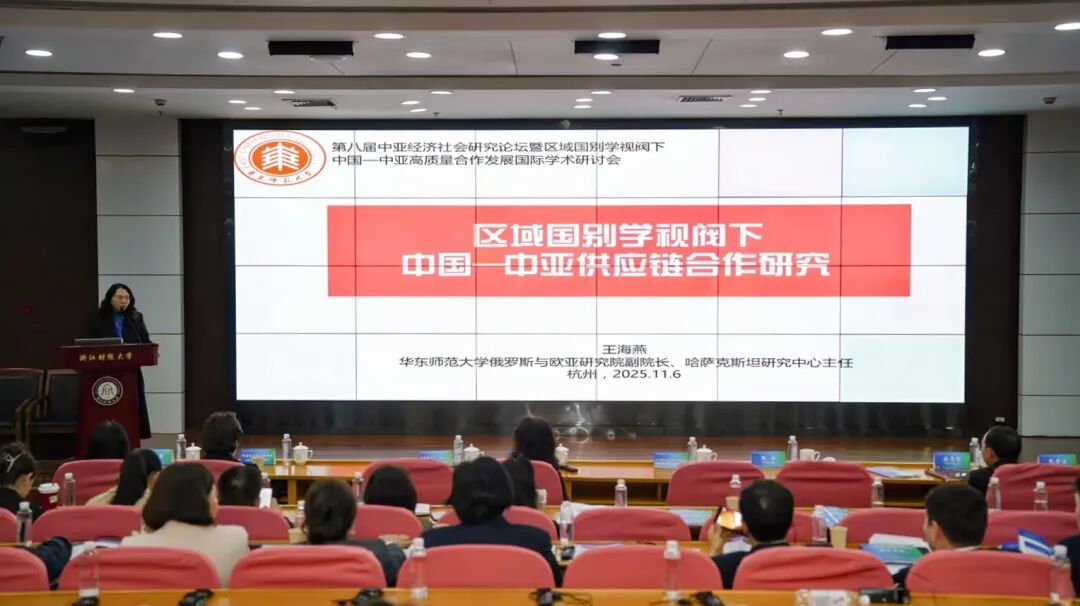 11月8-9日,王海燕老师赴杭州参加第八届中亚经济社会研究论坛暨区域国别学视阈下中国-中亚高质量合作发展国际学术研讨会,该会议由浙江财经大学主办,浙江财经大学国际学院、中亚研究院、经济学院承办,新疆霍尔果斯经济开发区管委会、杭州市钱塘区社会科学界联合会、新疆伊利师范大学“一带一路”发展研究院协办。来自哈萨克斯坦共和国总统直属战略研究所、乌兹别克斯坦世界经济与外交大学、哈萨克斯坦国立欧亚大学、哈萨克斯坦阿斯塔纳国际大学、哈萨克斯坦阿拉木图管理大学、乌兹别克斯坦塔什干国立东方大学、吉尔吉斯斯坦德隆电视台的10余位中亚国家学者,与来自教育部高校国别和区域研究工作秘书处、浙江省贸促会、中国社科院俄罗斯东欧中亚研究所、浙江财经大学、华东师范大学、浙江大学、西北大学、西安外国语大学、伊利师范大学、杭州码猿教育科技有限公司等国内外共60余名政企学界专家学者作专题交流,200余名中外师生现场聆听。