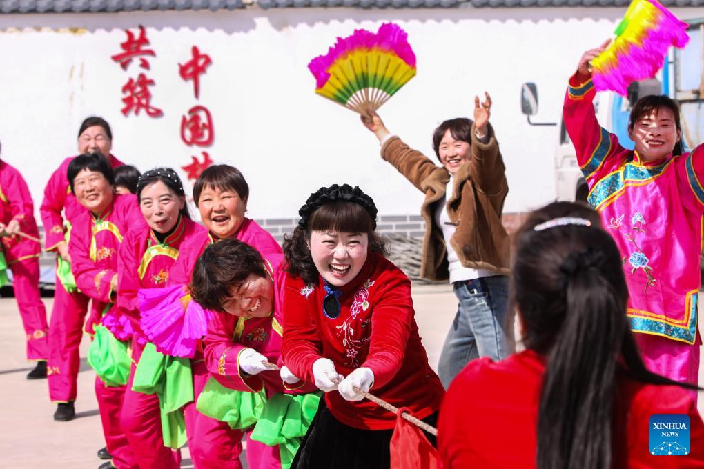 2024年3月8日,河南省焦作市博爱县太子庄村的村民在进行拔河比赛。