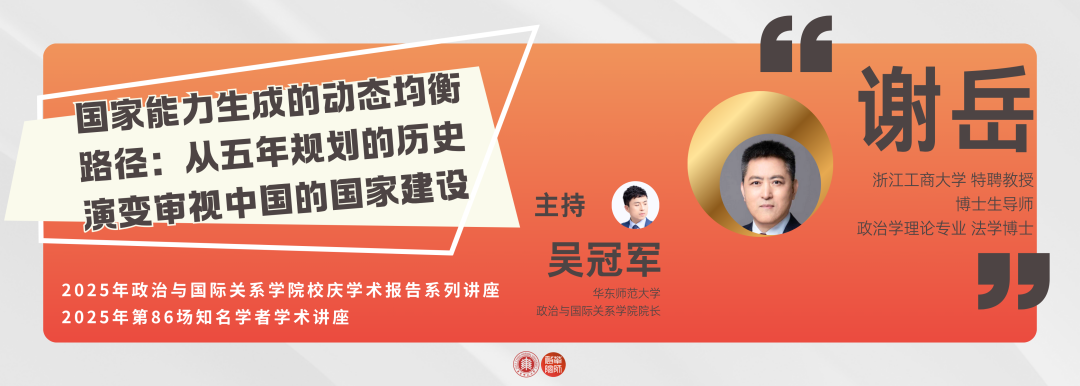 10月15日13时,政治与国际关系学院校庆学术报告系列讲座之“国家能力生成的动态均衡路径:从五年规划的历史演变审视中国的国家建设”在华东师范大学闵行校区法商南楼228会议室举行。本次学术讲座由浙江工商大学特聘教授谢岳主讲,政治与国际关系学院院长吴冠军主持,王向民教授、王逸帅副教授、吕同舟副教授亦出席讲座。