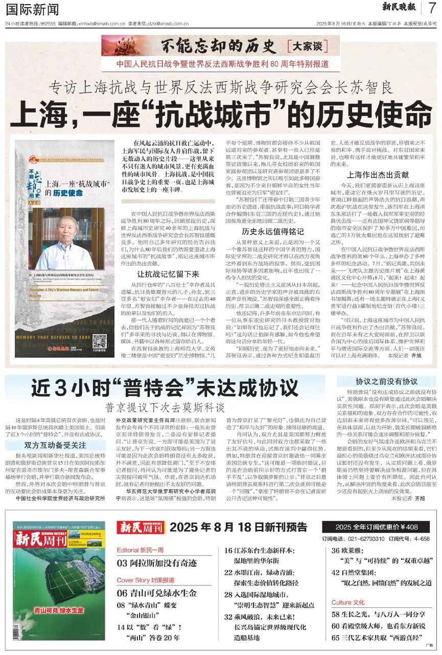 华东师范大学俄罗斯研究中心助理研究员郑润宇今日接受《新民晚报》采访,评普京与特朗普的会晤。文章刊于2025年8月16日《新民晚报》7版国际新闻。